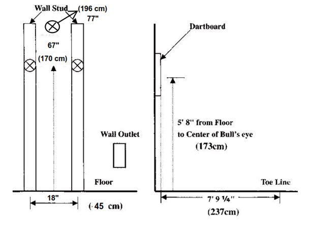 Die Aussparungen für die Aufhängung auf der Rückseite der Scheibe befinden sich 18 inch (45cm) auseinander. Damit können Sie die Scheibe an der Wand befestigen. Markieren Sie einen Punkt auf 67 inch (170 cm) vom Boden. Markieren Sie dann 18 in (45cm) genau daneben einen zweiten Punkt. Das Bulls Eye soll sich bei 5ft. 8 inch (173 cm) befinden.
