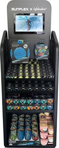 sunflex MDF-Display, Halbpalette, bestückt mit sunflex Camo Artikeln. Durch ihr extrem geringes Gewicht und die gute Griffigkeit sind unsere Jerseyprene Lite Sportartikel perfekt für das Wasser geeignet, also ideal für Reisen und Urlaub. Die Produkte sind auch bei starker Sonnenbestrahlung 100% lichtbeständig. Durch die hohe Elastizität und Stabilität von Jerseyprene lite sind die Artikel für Kinder geeignet.