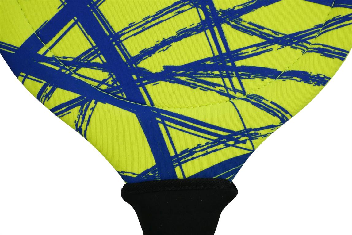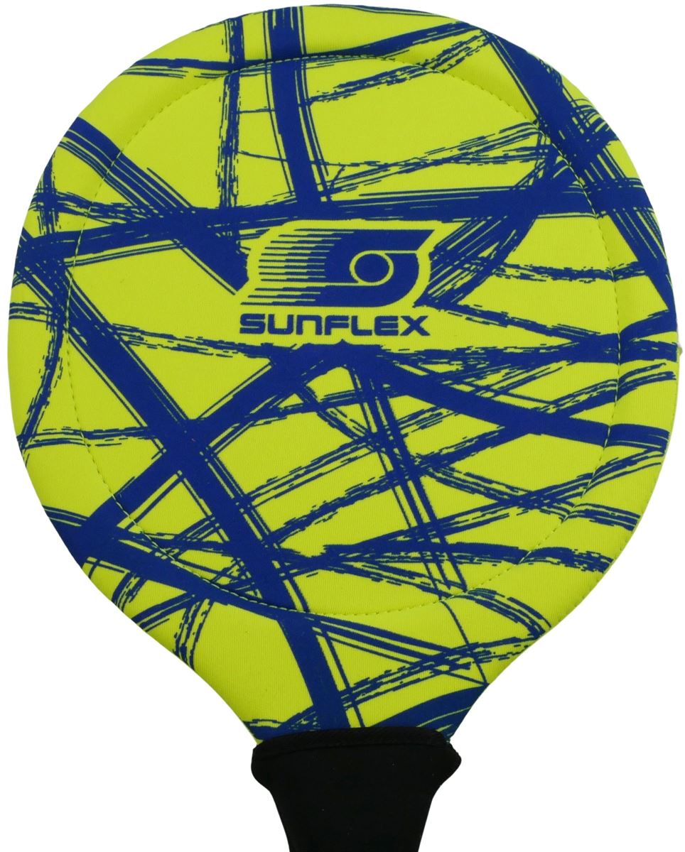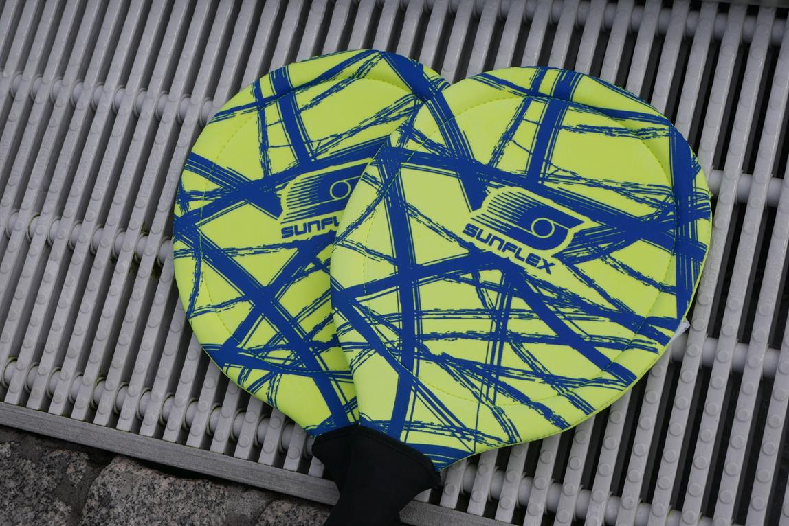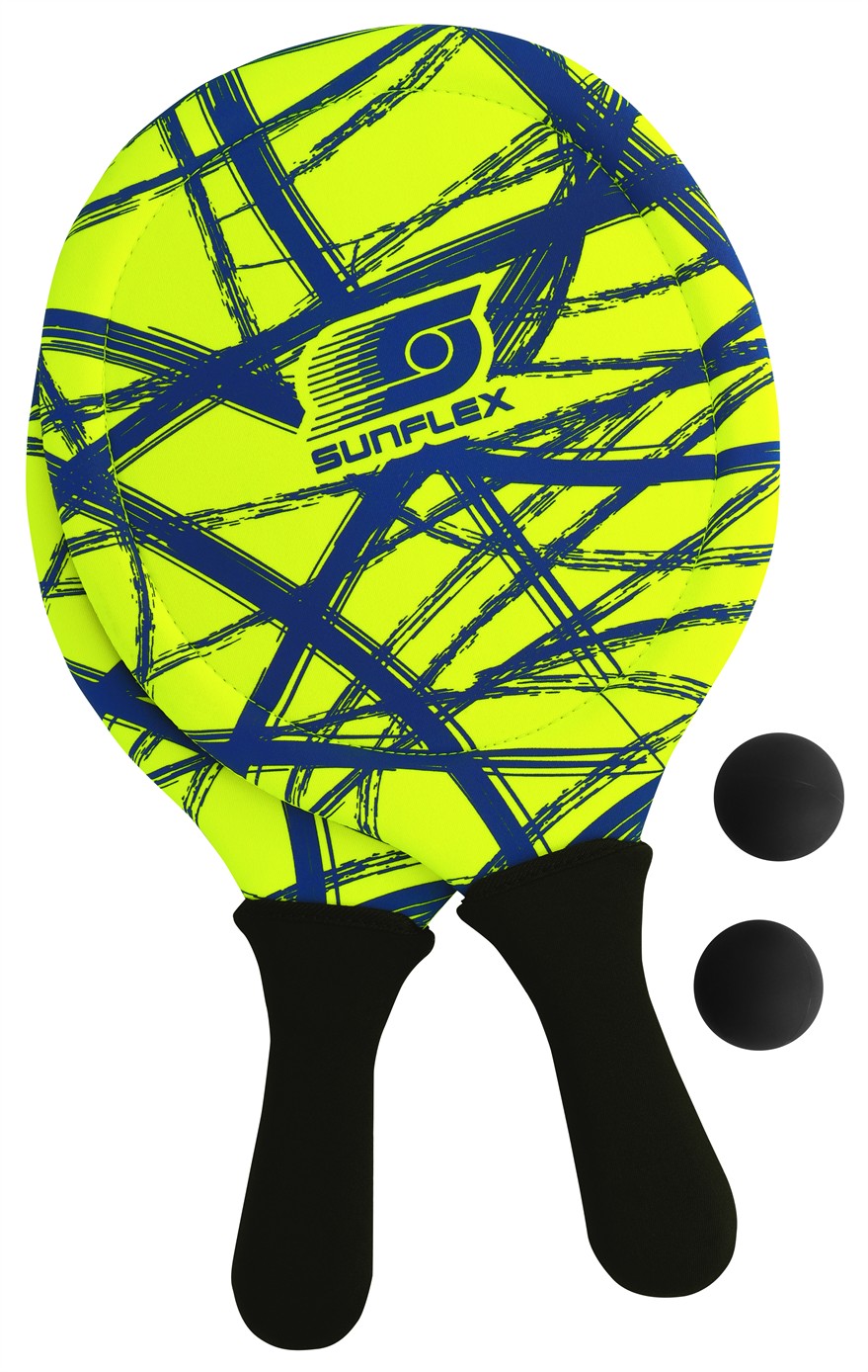sunflex BEACHBALL SET FUNKY CROSSED, 2 hochwertige Beachball-Schläger aus Jerseyprene Lite inklusive 2 Bälle. Perfekt für Wasser, Strand und Wiese. Wasserfest, extrem stabil und griffig. Die Rahmenkonstruktion sorgt für ein präzises und gefühlvolles Spielvergnügen. Netzverpackt.
