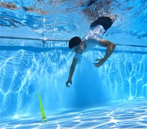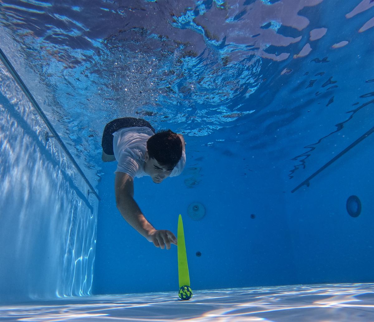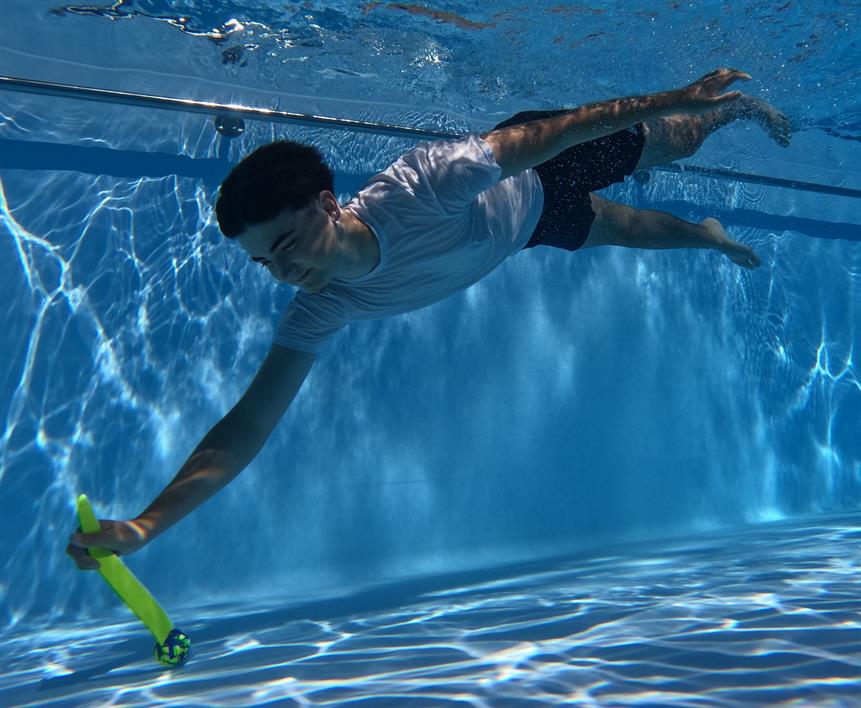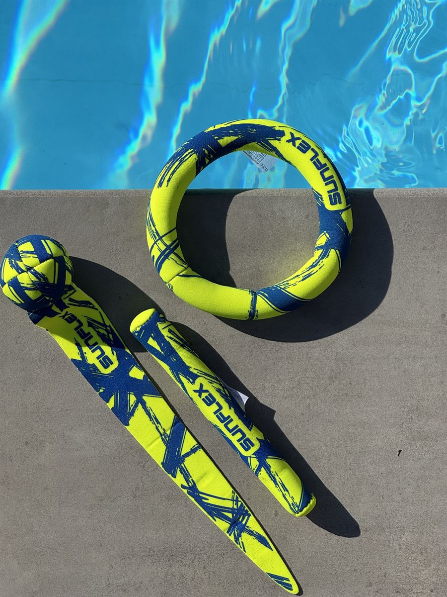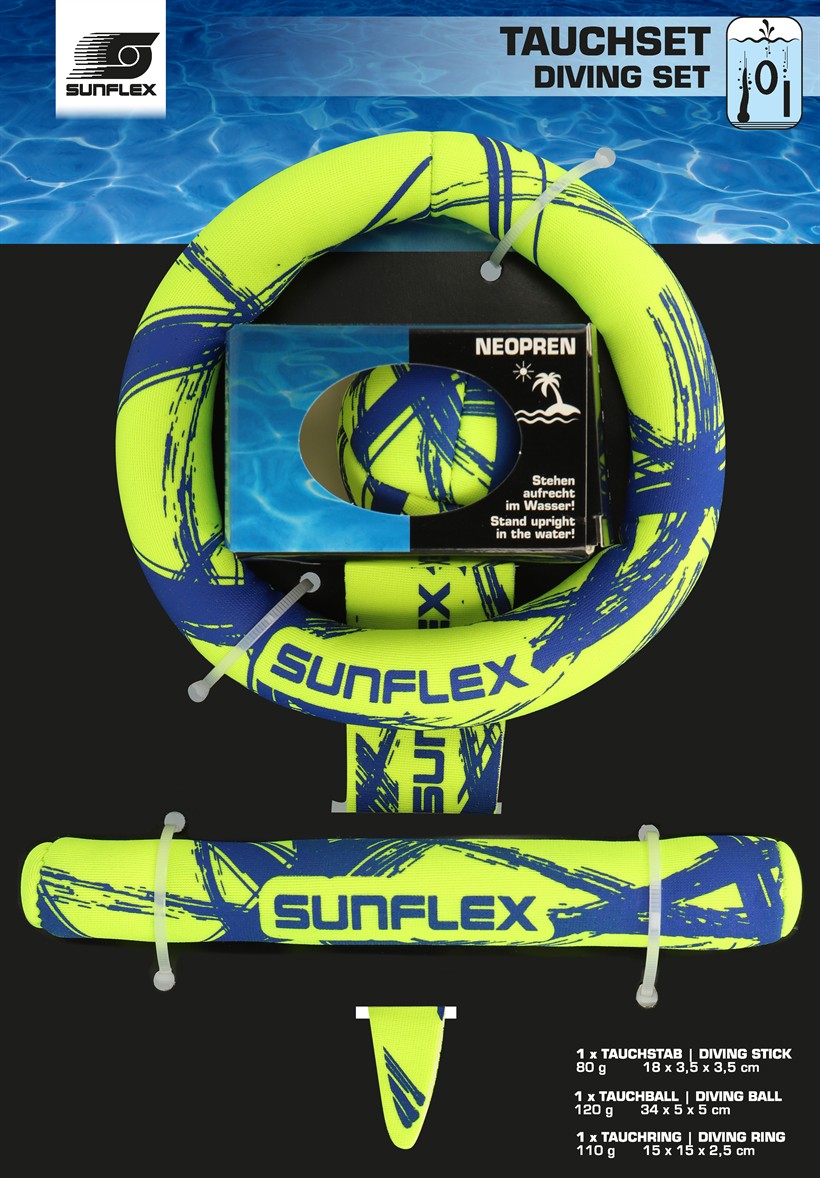sunflex TAUCHSET FUNKY CROSSED aus Jerseyprene Lite besteht aus 3 Teilen: 1 Tauchring, 1 Tauchball und 1 Tauchstab. Alle 3 Tauchartikel stehen gut sichtbar senkrecht im Wasser. In Kartonverpackung.