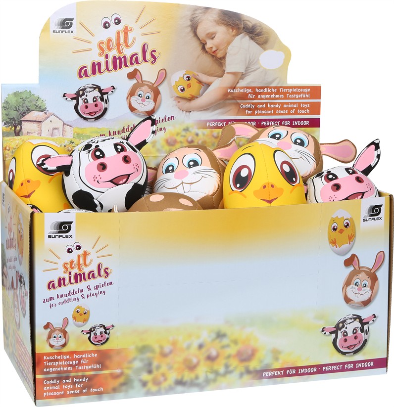 sunflex SOFT ANIMALS Display: Einzelverkauf der Softbälle im 12er Thekendisplay. Beinhaltet je 4 Bälle von Artikel 74036, 74037 und 74038.