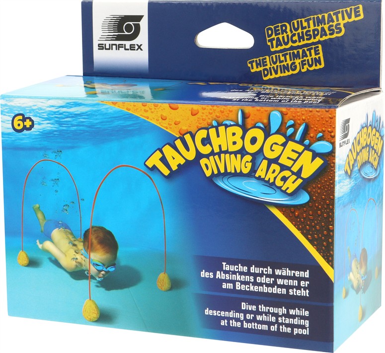 Erlebe das ultimative Tauchabenteuer mit dem sunflex TAUCHBOGEN! Dieses innovative Tauchspielzeug ist perfekt für alle Wasserratten und sorgt für Spaß und Herausforderung im Pool. Der sunflex TAUCHBOGEN besteht aus einer 2 Meter langen Gummischnur, die an beiden Enden mit Sandsäckchen ausgestattet ist. Diese Konstruktion sorgt für Stabilität und ein einzigartiges Tauchvergnügen. Während die Schnur auf den Boden des Pools sinkt, bildet sie einen Bogen. Dieser bleibt auch bestehen, nachdem die Schnur den Boden erreicht hat, und schafft so eine faszinierende Unterwasserstruktur. Der sunflex TAUCHBOGEN ist ideal zum Durchtauchen geeignet. Egal ob während des Sinkens oder nachdem er am Boden steht – der sunflex TAUCHBOGEN bietet abwechslungsreichen Tauchspaß und fördert gleichzeitig die Geschicklichkeit und Ausdauer. In Kartonverpackung.