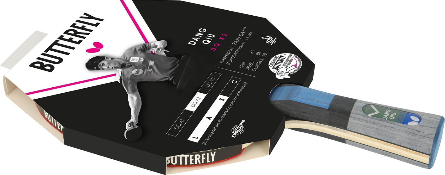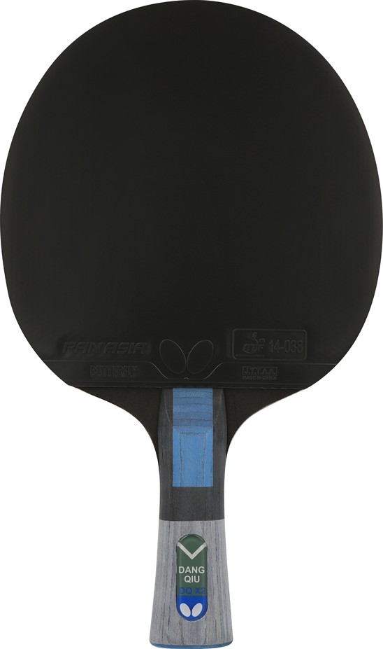 Sehr guter Trainingsschläger Butterfly DANG QIU DQX2 für geübte Spieler. Der Pan Asia Belag mit einem 1,8 mm Schwamm und Ergo Grip ermöglicht ein ausgewogenes Verhältnis zwischen Offensiv- und Defensivspiel. Konkaver Griff. In Kartonverpackung.