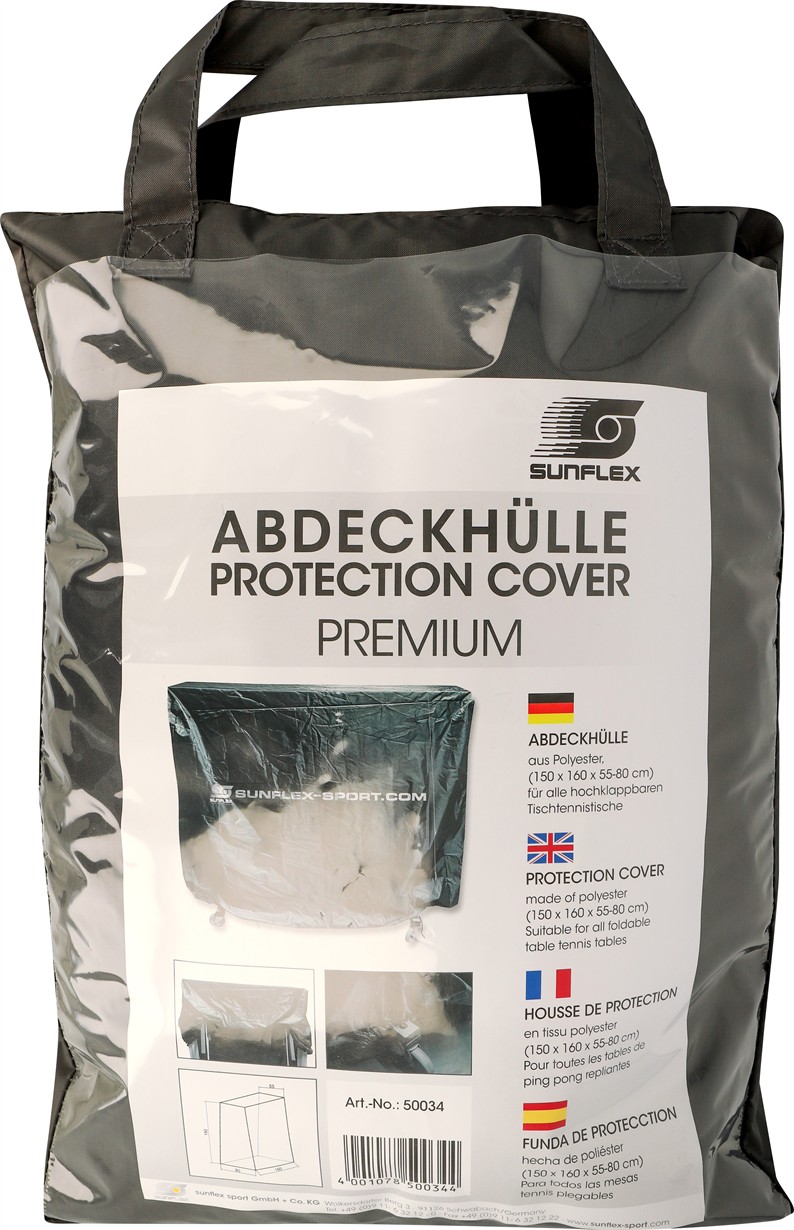 Praktische Abdeckhülle aus Polyester mit Gummilaschenverschluss für alle hochklappbaren Tischtennisplatten. Einfache und schnelle Montage, sicherer Schutz gegen Nässe, Witterung und Schmutz. Im Druckverschlussbeutel.