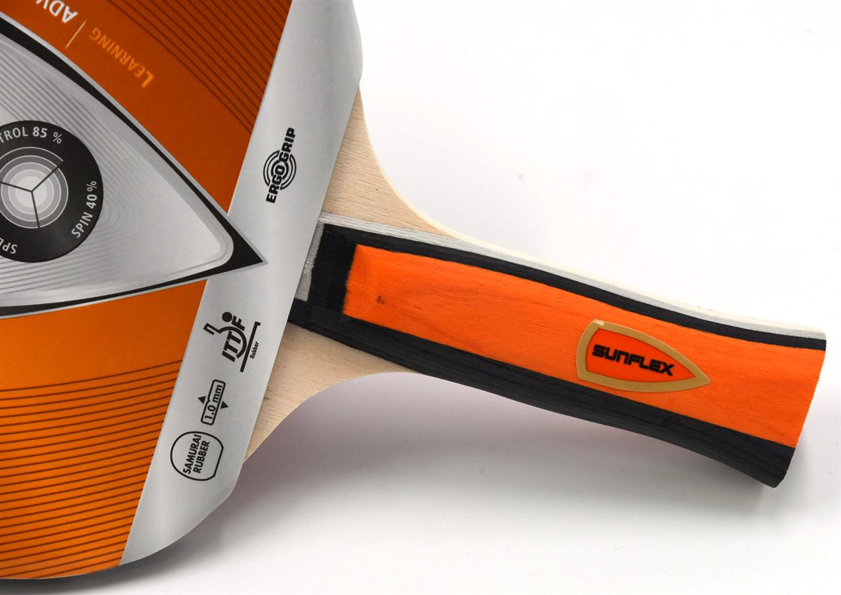 Freizeitschläger sunflex MOTION A25 mit 1,0 mm Schwamm und Samurai Belag, ITTF zugelassen, Ergo Grip und anatomischer Griff. Mit Stickfix.