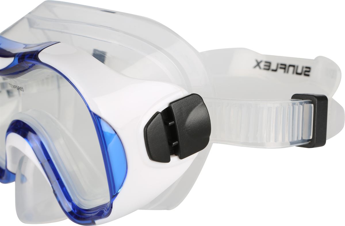 Die sunflex Tauchermaske SHARK ist das perfekte und notwendige Utensil für alle Hobby-Taucher zwischen 6 und 12 Jahren. Für höchsten Tragekomfort sorgt die exakt auf das Alter angepasste Maskengröße. Der wasserdichte und komfortable Doppelrand-Dichtungsrock bietet Schutz vor ungewolltem Wasser, Chlor und anschließendem Augentränen. Das gehärtete Sicherheitsglas der hervorragend verarbeiteten sunflex Tauchermaske SHARK ist nahezu bruchsicher und sorgt damit für ein sicheres und sorgenfreies Tauchen. Zum besseren Halt am Kopf trägt das zweireihige, hochwertig produzierte Silikonkopfband bei, das verstellbar und unter Wasser einfach gehandhabt werden kann. So komfortabel war tauchen noch nie! Im Blister.