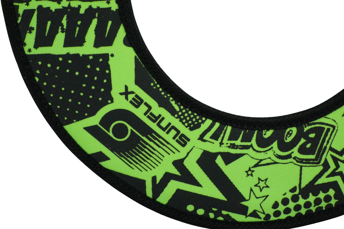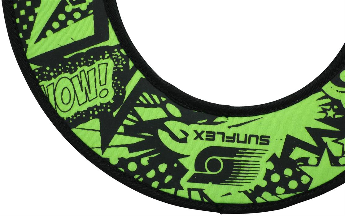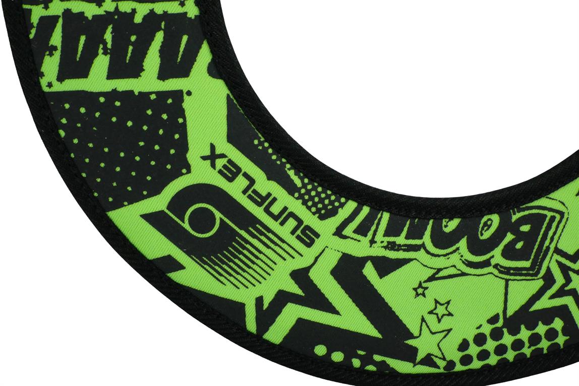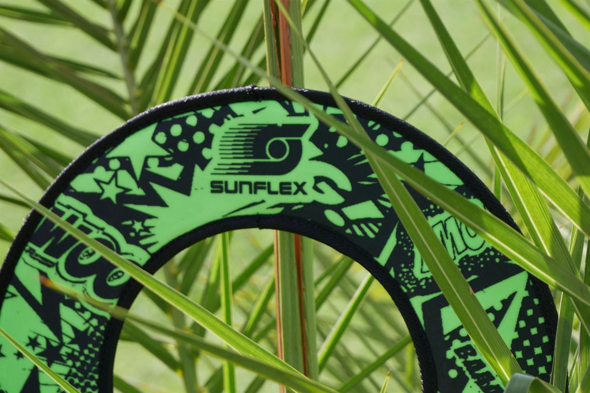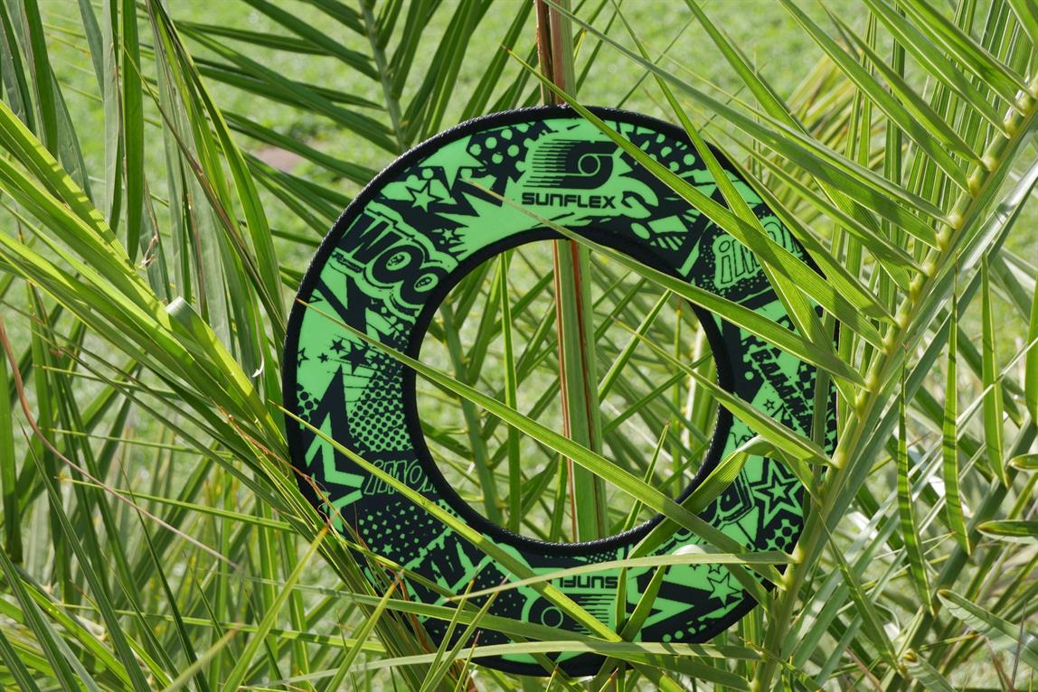 sunflex Titan ring FUNKY BOOM is foldable due to the flexible vinyl material. The ring keeps its flight path even if there is contrary wind. The ring is comfortably and easily catchable, especially because it is foldable. Carton packaging.