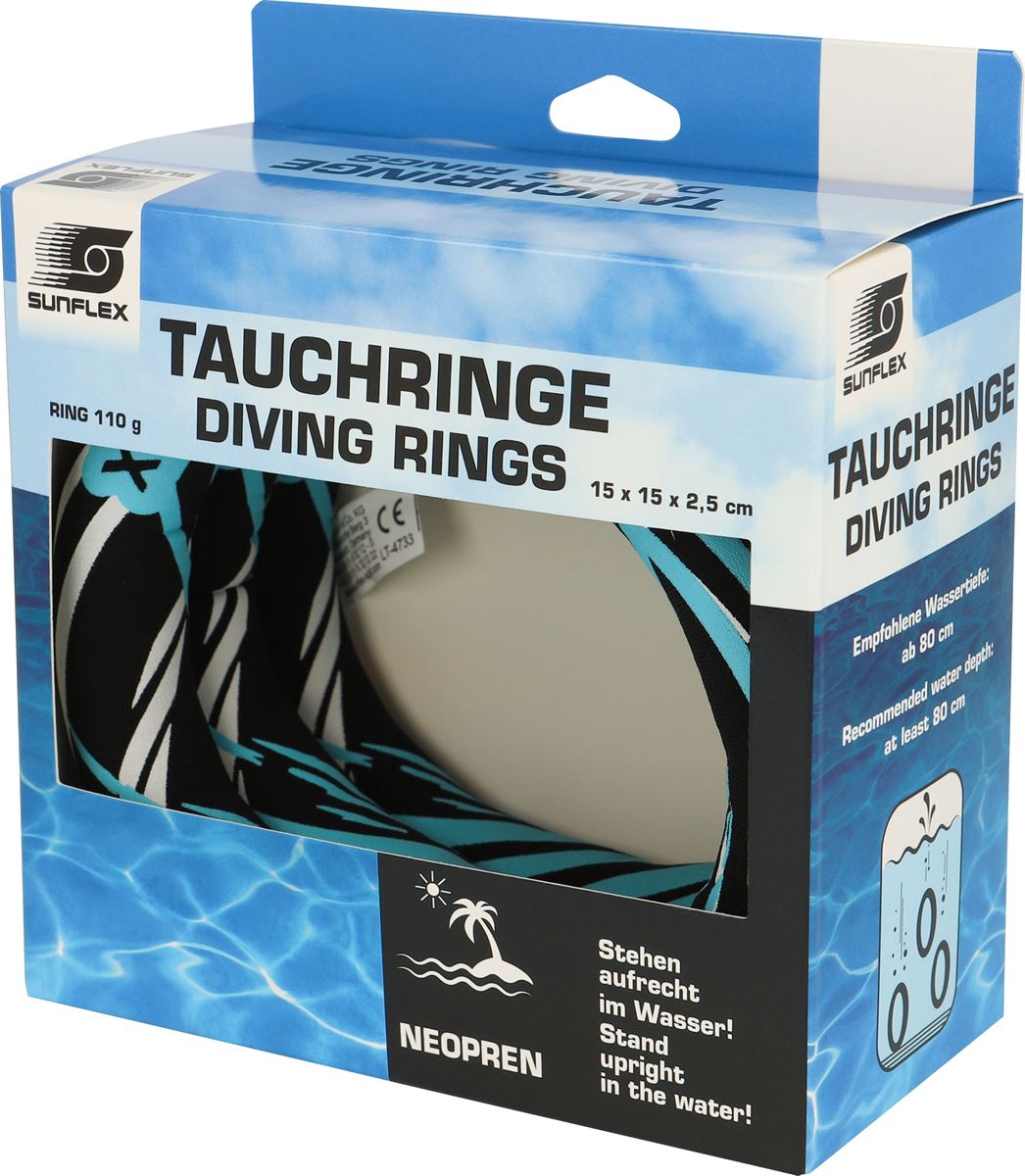 sunflex DIVING RINGS ACTION PRO made of neoprene stand upright at the bottom of water and therefore easy to catch. 3 pcs., carton packaging.