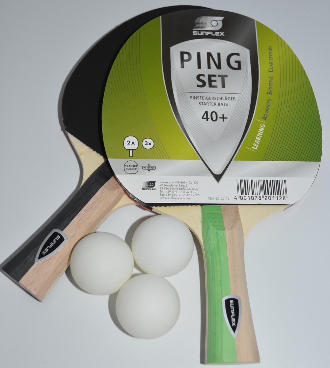 TT-set sunflex PONG with 2 training bats, pips in on 1.0 mm sponge, 3 tt-balls, plastic ball 40+, concave handle, carton packed.